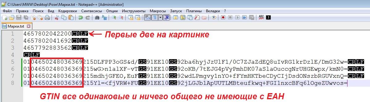Знатоки Розницы 2.3 - подскажите. Возможно вопрос элементарный, но я много работаю с маркировкой в других программах, а типовая Розница(базовая, исправить алгоритм как я его себе понимаю, возможности нет!) у меня всего пара штук на обслуге... С таким столкнулся первый раз. Подозреваю, что это косяк производителя товара, но, может есть какой-то способ решения/обхода проблемы? В общем: Есть 4 РАЗНЫХ товара. По ЕАН - три разных, у двух товаров одинаковый, хотя товары разные, с разными ценами... Ну, это ладно, на один можно напечатать свой внутренний, это не проблема. Проблема в другом - у всех четырех, в кодах марок одинаковый GTIN - ! Вот: Фотки марок:  А это, ШК ЕАН и коды марок со сканера:  Если марки не привязаны поступлением к конкретному товару(а это у нее сплошь и рядом, магаз маленький, оборот ни какой, интегрированного ЭДО нет, а просто подписывает УПД в СБИС и "забивает" товар руками), то если в чеке "пикнуть" сразу марку, Розница говорит - "не знаю такого, уточните, что это за товар". Все верно. Выбираем товар из списка или вручную, или по ЕАН, не важно. Марка продается, все хорошо, но, при этом привязывается по GTIN к товару, который продали! Продаем следующий(но, ДРУГОЙ! физически, из этих четырех) товар, опять "пикаем" марку. Выходит первый товар, который привязали! Ну, понятно, по GTIN из марки находит... Ладно, отменяем, "пикаем" ЕАН второго товара, товар находится правильно, запрашивается марка. "Пикаем" марку... И вот тут - фигвам! Ругается, что марка не принадлежит этому товару, и не добавляет в чек... Понятно, GTIN из марки привязан к другой карточке... И что с этим делать? Можно как-то обойти это типовыми средствами? PS Нет, я конечно вижу выход из положения - написать обработку, которой удалять из базы привязанные марки по этому GTIN, проданные ранее, перед продажей нового товара, если перед этим продавался другой, и при продаже привязывать марку каждый раз к новому товару... Хорошо их всего таких только 4 (позиции, самих товаров конечно не по одному каждого вида, а по несколько)... А если бы их было сотня? Бред какой-то... Может есть какой-то более простой способ обходить такие косяки? | |||