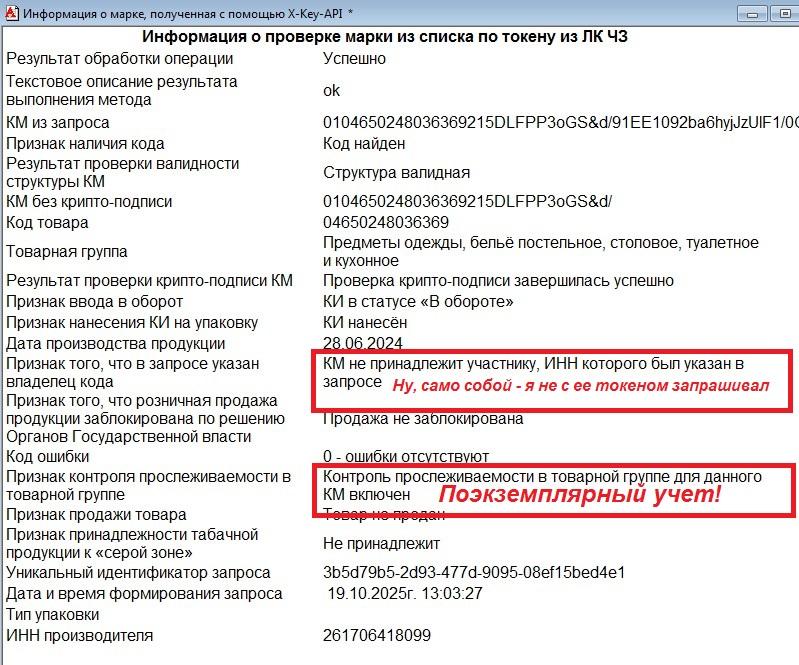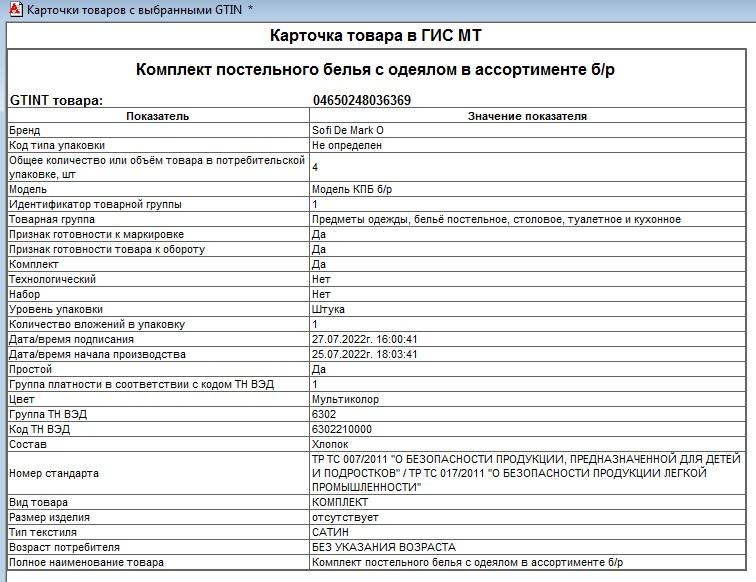 Да, все верно... Было в начале учета марок по этой ТГ, "типа акция", промаркируйте остатки в том числе и в рознице, до какой-то даты Х... Типа, как-то это должно было повлиять на "безопастность" продаваемого товара... (Как???) :-( Это был просто способ дособрать неполученные деньги за марки, на товары, которые уже в продаже. Ладно у производителей, тут, как-то понятно, ну... у перекупов, еще как-то с натяжкой можно попробовать обосновать... Но, маркировать остатки товара в рознице - тут только "жадность", больше нет обоснований - марок заказывали на маркировку таких остатков, приобретенных "непонятно где" тысячами, и это только у меня... А в масштабах страны, цифры даже представить трудно. Конечно, разве можно было упустить "такой лакомый кусок" :-( Но, "маркировка остатков по упрощенной схеме" шла с использованием GTIN-ов специальных, выдаваемых для этих целей самим ЦРПТ - они все начинались на "029***********", типа внутренние от самого ЦРПТ... И даже для этого магазинчика, я в свое время заказал и напечатал несколько тысяч марок, на максимум десяток таких GTIN... Но, там явно было не десяток разных карточек товаров на эти "псевдо-марки"... И ведь работало, сабжевой проблемы почему-то не возникало... Возможно, Розница понимала, что эти марки начинались на "029", и соответственно это маркировка по упрощенной схеме, и ни куда их привязывать не нужно... Поэтому и проблемы не возникало. Тут-же, марки явно не по упрощенной схеме должны были выдаваться, а на конкретный товар, так, как GTIN начинается на "046"... По GTIN из марки, в ЦРПТ есть конкретная карточка товара:  Естественно, она будет одной и той-же для всех этих 4-рех товаров(ну, это 4 у моего клиента, возможно их значительно больше)... Ничего общего эта карточка не имеет с наименованиями конкретных товаров на этикетках... Да, там в названии товара есть приписка - "в ассортименте"... Но, с моей точки зрения, товар в ассортименте - это практически один и тот- же товар, с минимальными различиями(ну, там цвет, запах, вкус :-) ) не влияющими на розничную цену (она ОДНА для всех товаров этого ассортимента), и так-же продающийся на кассе как один товар в ассортименте... Но, тут, товары разные, с РАЗНЫМИ розничными ценами, и соответственно карточка в 1С своя на каждый... Неужели только у меня такой вопрос возник? Должно же быть какое-то решение в типовой конфе? PS Вообще, ИМХО - привязка и особенно контроль соответствия марки конкретному товару в своей базе - лишний гиморой... Как минимум, должен быть какой-то способ отключать этот контроль, когда он не требуется. Типа "галочка" в карточке, "не контролировать соответствие марки этому товару"... С точки зрения ЧЗ - тут ни каких проблем не будет - им по барабану наша база, и все, что в ней творится... Они получили в чеке марку, и по ней списали марку с карточкой, которая у них к ней привязана... Цены их тоже не интересуют (ну, за исключением табачки - там МРЦ)... Как кто решает такие проблемы? Может все-таки есть какое-то отключение контроля принадлежности марки конкретному товару, и я просто не нашел его? Еще раз - конфа "базовая", и "допиши сам" тут не прокатит. | |||