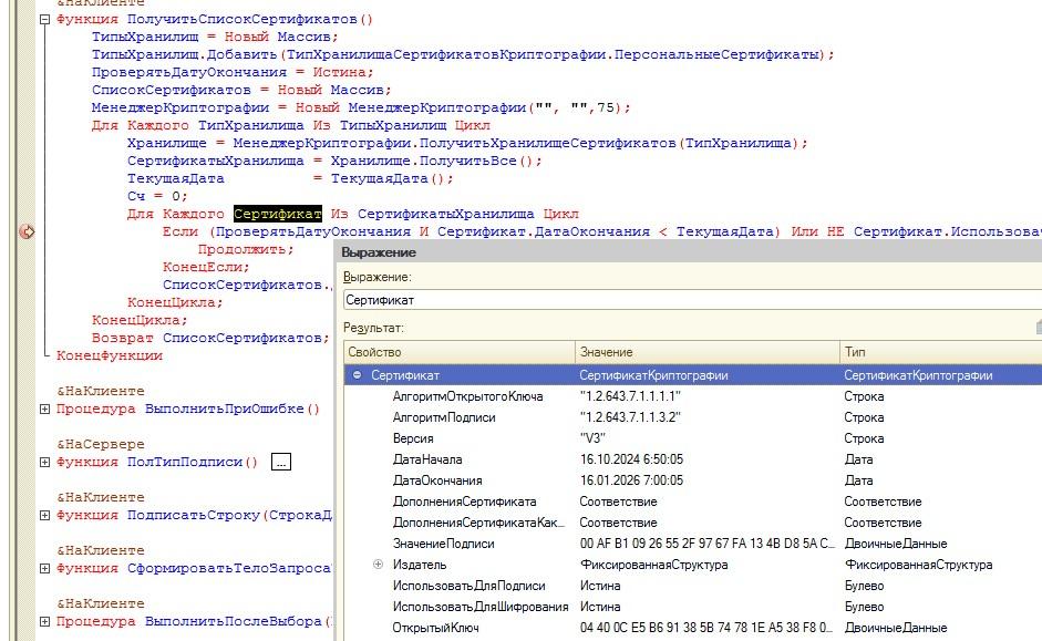 Надо будет подумать и переделать, убрать первую часть с 1Совскими объектами совсем, сразу из КриптоПро получать список и выбирать. Но, это уже под настроение :-)